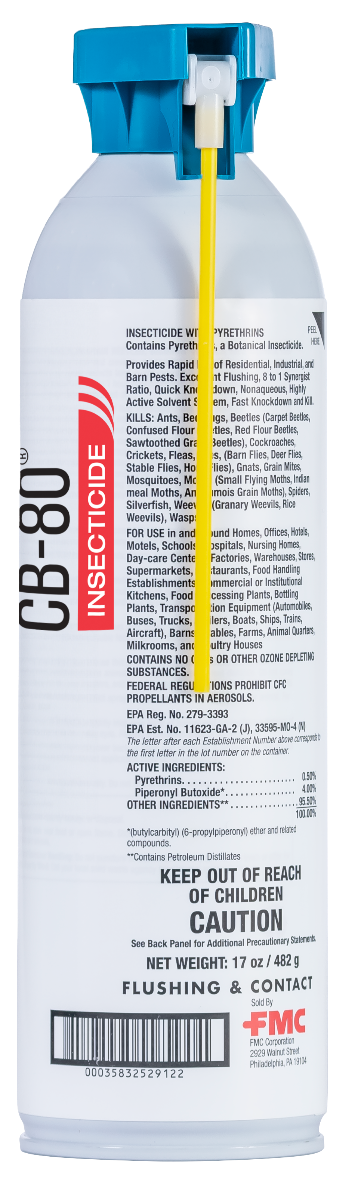 CB-80 insecticide is a leading flushing and contact insecticide that has earned its outstanding reputation for the knockdown and kill of cockroaches and over 20 other pests. With its 8:1 synergist to pyrethrin ratio and dual-spray-action-actuator, CB-80 insecticide is ideal as a space or crack and crevice spray and boasts a broad list of use areas, including restaurants and other food-handling establishments, food processing plants, hospitals, supermarkets, motels and hotels, residences, and transportation equipment. CB-80 is acetone-free, compliant with all current VOC standards and contains no ozone-depleting substances.
