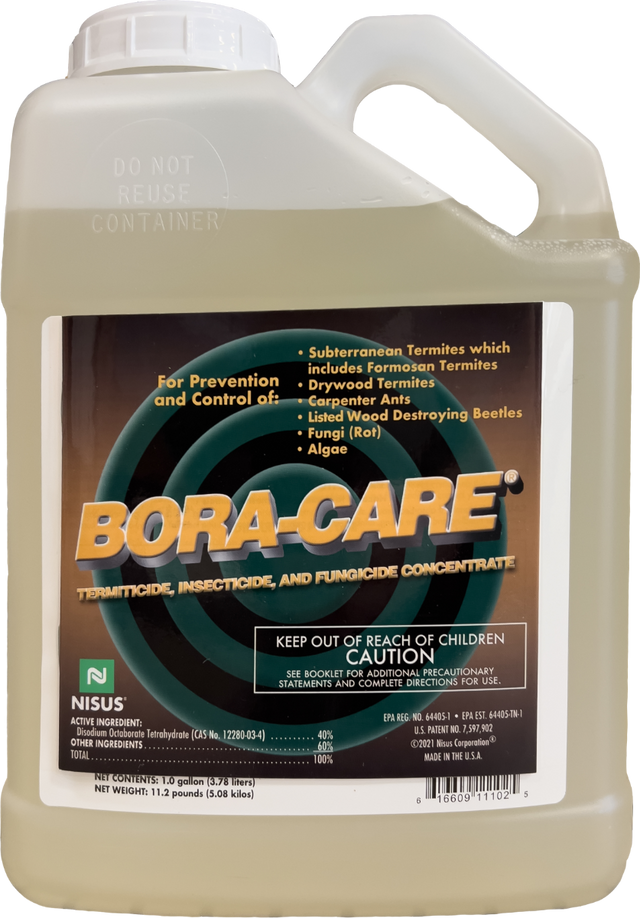 Bora-Care is a "green" borate-based termiticide that can be applied directly to wood, concrete and foundations to eliminate wood as a food source and create a continuous barrier that termites cannot cross. Bora-Care's unique patented formula allows its active ingredient to penetrate into wood, delivering long-term residual protection. Treated wood is also protected against carpenter ants, wood destroying beetles and decay fungi.