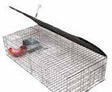 This humane pigeon trap includes a water container and feeder pan as well as a hinged shade screen. Measuring 35" x 16" x 8", it has a 12+ pigeon capacity. It is lightweight at only 10 pounds, and has a centered top access door for easy removal of birds