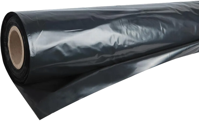 A roll of plastic sheeting used as a vapor barrier. Shipped in a roll with paper wrapping on a pallet, sold by the roll.