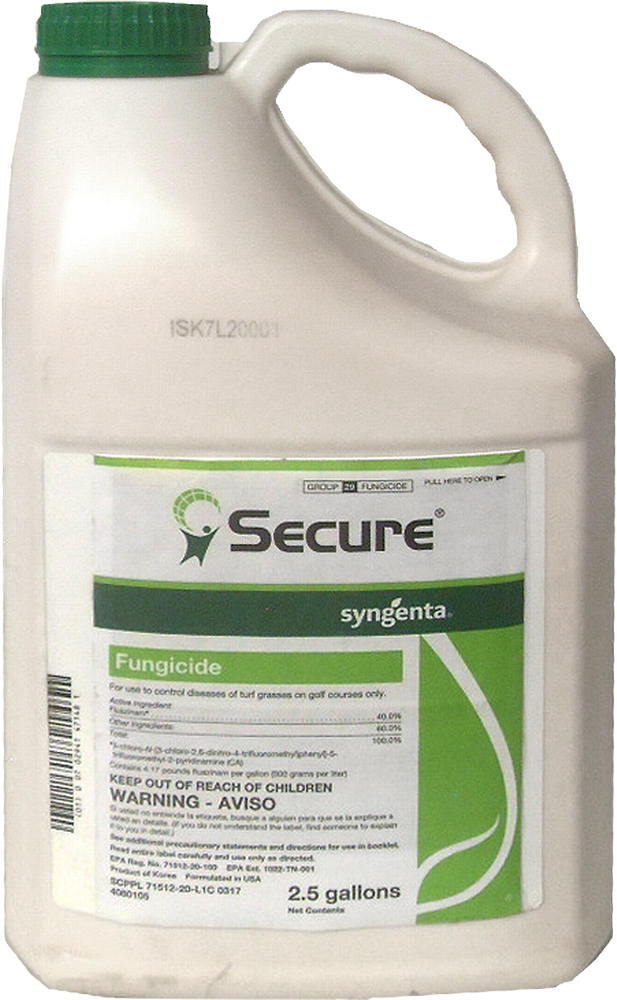 A unique class of multi-site contact fungicide Secure fungicide is a multi-site contact fungicide, in a unique chemical class, for golf courses. It contains the active ingredient, fluazinam, and is the only registered fungicide for turf in FRAC group 29. It has no known resistance and as a multi-site contact, it has very low risk of developing resistance. Secure is the ideal rotation partner with Daconil Action fungicide for season-long protection against the toughest turf diseases with no interruptions. Now, systemic fungicides no longer replace your contact applications, but rather compliment for inside out protection. Secure not only provides superior protection against dollar spot, but also controls 10 additional turf diseases. It even controls dollar spot that is resistant to other chemistries.Features and Specs