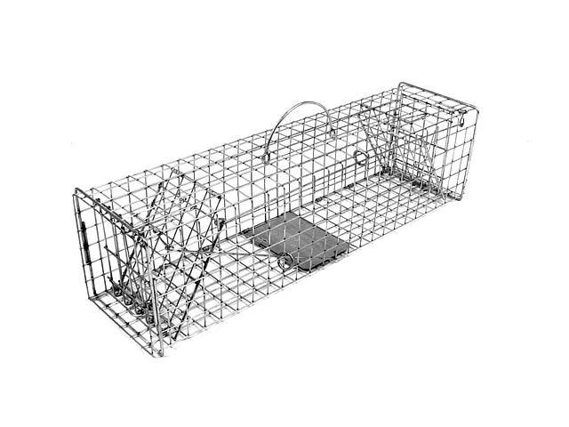 Model 104 is an Original Series Live Trap with two trap doors for squirrels, muskrats and similar size animals. Double door traps can be used as bait-less runway traps or set only one trap door to use as a single door baited trap. Trap doors at both ends also calms wary animals by allowing them to see through the trap without obstruction and enter with confidence. This cage trap weighs three pounds and measures 24L x 6W x 6H. It is constructed of 1"x1" 14 gauge galvanized wire mesh.